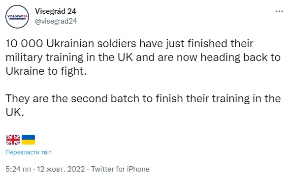 В Великобритании завершили обучение десять тысяч украинских военных. Об этом в среду, 12 октября, сообщила информационная группа Visegrad 24 в Twitter.