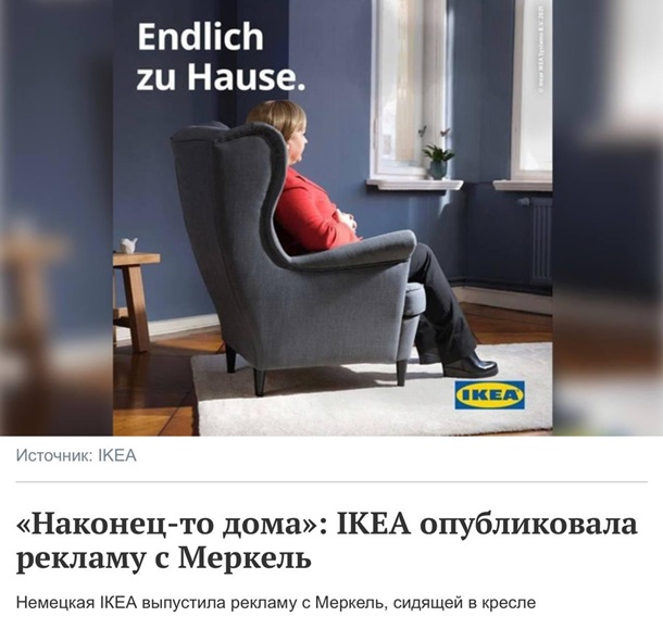 Компания опубликовала похожую на страницу одного из ее каталогов фотографию с изображением Меркель, сидящей в кресле IKEA, и подписью «Наконец-то дома».
