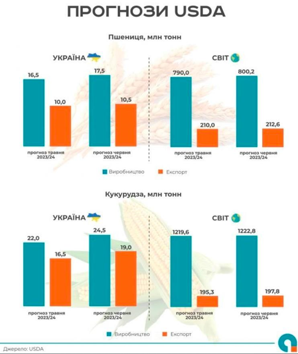 Згідно прогнозів, у 2023-24 маркетинговому році показники України щодо виробництва пшениці та кукурудзи збільшаться в на 1,0 млн т до 17,5 млн т та на 2,5 млн т до 24,5 млн т, відповідно, в порівнянні з прогнозом місяць тому.