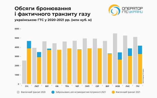 «Всего в 2021 году было забронировано 44,4 млрд куб. м транзитных мощностей на точках выхода из России (40 млрд куб. м, согласно условиям действующего транзитного контракта, 4,4 млрд куб. м, были забронированы на месячных и суточных аукционах), но из них использовано лишь 41,6 млрд куб. м. Несмотря на значительный рост цен на европейских газовых рынках из-за дефицита природного газа и сокращения запасов в европейских ПХГ, возможности украинского транзитного маршрута – более чем достаточные для преодоления газового кризиса в ЕС – не были задействованы. Напротив, в период наибольшего роста цен на газ в октябре-декабре на газовых рынках Европы и начале осенне-зимнего периода среднемесячный транзит газа из России в страны ЕС был на 17% ниже, чем в январе-августе», — говорится в сообщении Оператора ГТСУ.