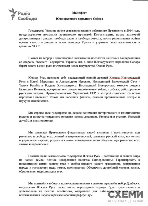 В нем говорится, что Украина «утратила легитимность в пределах УССР» после свержения Януковича. «В ответ на террор и тоталитарное навязывание идеологии нацизма и бандеровщины со стороны бывшего Государства Украина мы, в лице Южнорусского народного Собора берем власть в свои руки и учреждаем новое государство Южная Русь», — говорится в «манифесте».