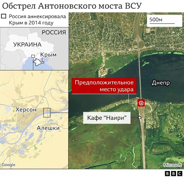 «Антоновский мост является основной линией снабжения для оккупантов на левом берегу Днепра. Они находятся под прицелом Вооруженных сил Украины. ВСУ очень успешно уничтожают склады и командные пункты в тылу врага. Поэтому можно говорить, что украинские войска готовят зону запрещенного доступа на этом направлении», — пояснил в эфире Еспресо военный эксперт, глава информационно-консалтинговой компании Defense Express Валерий Рябых.