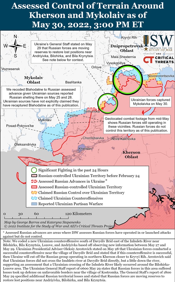 В сводке американских военных экспертов за 30 мая говорится, что «ограниченная» украинская контратака в северной части Херсонской области за последние 48 часов не продвинулась дальше, но нарушила российские операции.