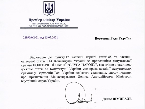 Назначить министром внутренних дел Монастырского предложил президент Владимир Зеленский. Фракция Слуга народа предложение поддержала.