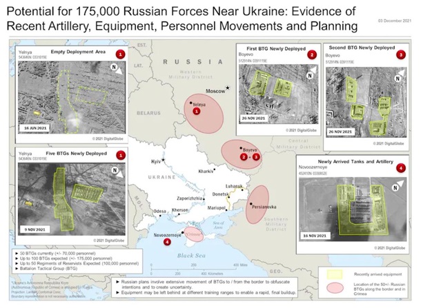 По данным американской разведки, пока на границе с Украиной находятся около 70 тысяч российских военнослужащих, но ожидается стремительное наращивание личного состава и проведение масштабных маневров «для сокрытия своих намерений».