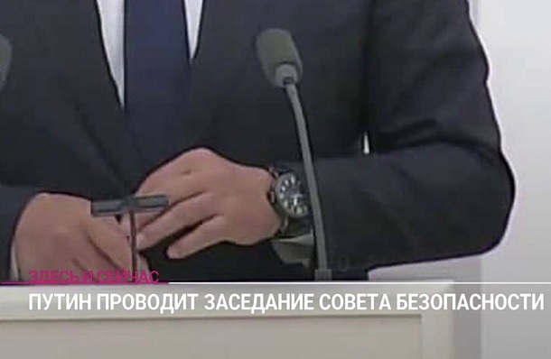 19:01 Заседание Совбеза России, которое транслировалось по российскому телевидению могло быть записано заранее. Пользователи обратили внимание на часы на руке Шойгу, которые показывали время на несколько часов отличающееся от времени прямой трансляции.