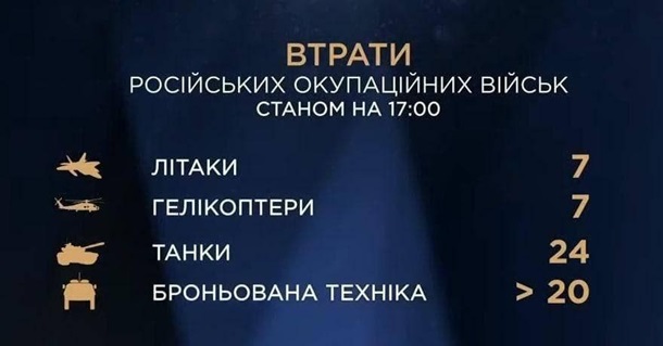 Президент России Владимир Путин объявил о начале спецоперации с целью «демилитаризации Украины» рано утром 24 февраля. Это уже полноценная война против Украины. По всей стране раздаются взрывы и идут бои. Украинская армия держит оборону, уничтожая вражескую технику и диверсантов. Вооруженным силам помогают десятки тысяч украинцев из Сил Территориальной обороны. Запад усиливает антироссийские санкции и направляет Украине помощь, Зеленский заявляет, что сейчас он — цель номер один, поскольку Кремль надеется свергнуть нынешнюю власть. В Москве заговорили о возможных переговорах в Минске. Корреспондент.net следит за событиями вокруг Украины в режиме онлайн.