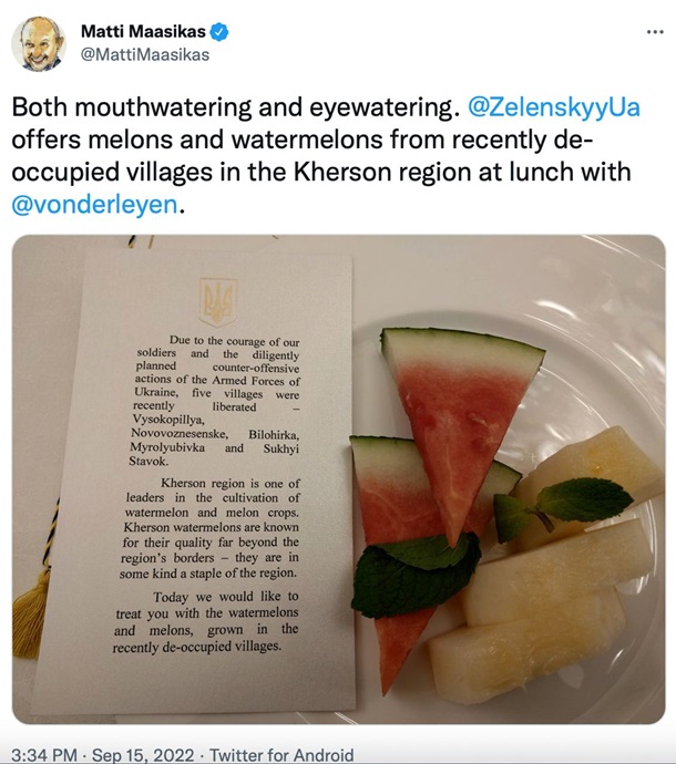 15:28 Подоляк обратился к странам Запада: «Не хотели эскалации? А вот она. Анексией, «ядерными» угрозами и тотальной мобилизацией Россия говорит цивилизованному миру: «И что вы со мной сделаете?» Москва пытается поставить Демократию на колени. Продолжим вести разговор о том, как не спровоцировать и не масштабировать войну?»