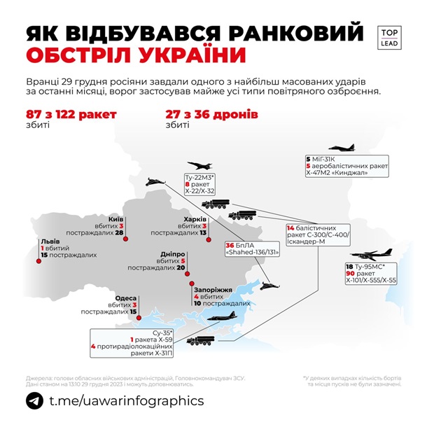 08:45 Вечером 30 декабря армия РФ выпустила по Харькову минимум шесть ракет, правоохранители изъяли обломки Искандер, сообщил глава ОВА Олег Синегубов. В результате обстрела Харькова пострадали 28 человек, из них 12 находятся в больнице. Среди пациентов — двое подростков 14 и 16 лет и иностранный гражданин. Повреждены жилые дома, здания гостиниц, учреждения здравоохранения: Областная клиническая больница, Областная стоматологическая поликлиника, две городские больницы, транспорт.