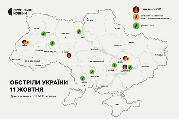 18:05 Укрэнерго сообщило, что из-за сегодняшних ракетных атак повреждено оборудование магистральной сети украинской энергосистемы сразу в нескольких регионах. В 17:00 компания предоставила операторам распределительных сетей объемы применения графиков аварийного отключения электроснабжения для промышленных и бытовых потребителей во всех регионах Украины.