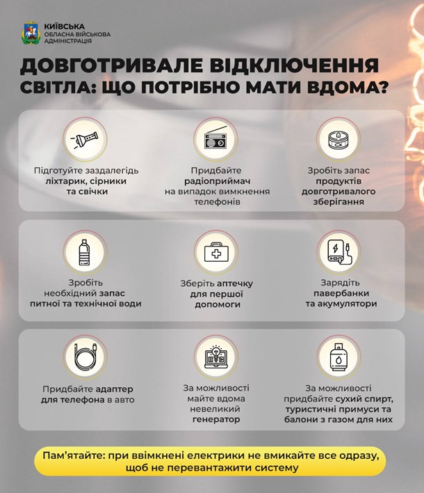 10:36 В Киевской области из-за массированных обстрелов повреждена энергетическая инфраструктура, без света осталась часть Киевского региона. Также в регионе вводятся экстренные отключения электроэнергии, предупредил глава ОВА Алексей Кулеба. Он призвал готовиться к длительному отсутствию электричества. А всех, к кому не применяются отключения света, власти призывают экономно использовать электроэнергию. По предварительной информации, в области есть один пострадавший, также есть разрушение частных зданий.