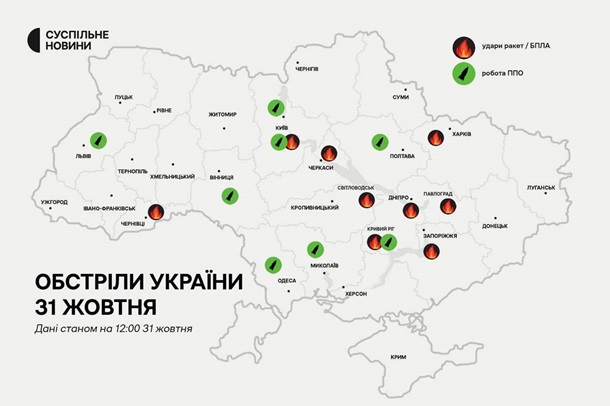 14:13 Суспільне показало карту сегодняшних ударов по Украине: