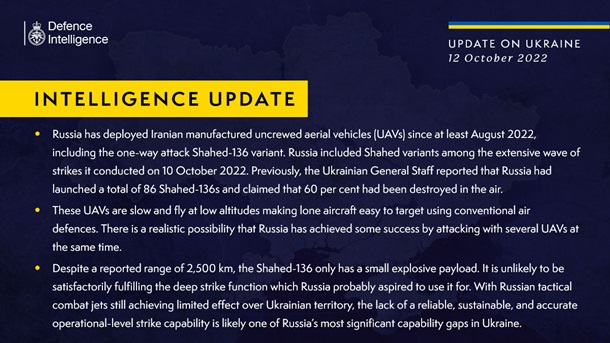 В британской разведке подчеркнули, что несмотря на заявленную дальность полета в 2500 км, Shahed-136 имеет лишь небольшую взрывчатую нагрузку и вряд ли может выполнять функцию глубокого удара.