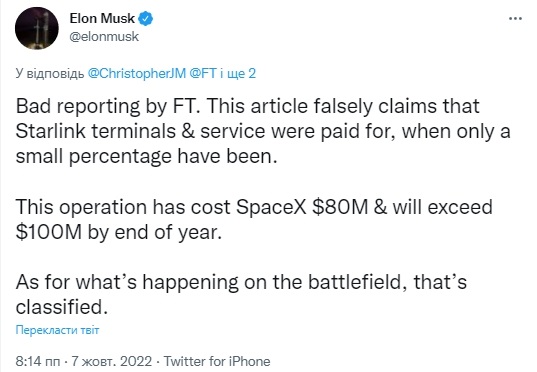 7 октября Маск сообщил в Twitter, что Украина получила около 20 000 спутников Starlink и эта операция обошлась SpaceX в 80 миллионов долларов, а к концу года превысит 100 миллионов долларов.