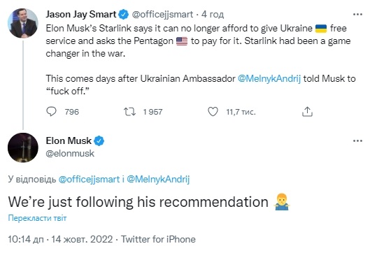 Отметим, американский политтехнолог Джейсон Смарт обратил внимание, что SpaceX отказалась предоставлять Украине бесплатные услуги Starlink через несколько дней после твита экс-посла Украины в Германии Андрея Мельника, написавшего Маску «Fuck off» в Twitter.