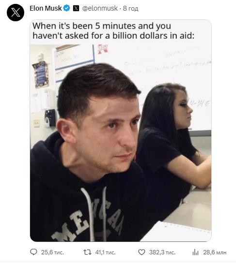 Миллиардер запостил изображение с украинским лидером, которое сопровождается надписью: «Когда прошло пять минут, и ты еще не просил о миллиарде долларов помощи».