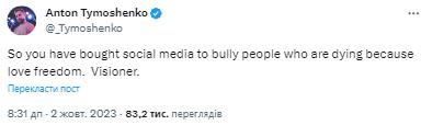 «Итак, вы купили социальные сети, чтобы издеваться над людьми, которые умирают из-за любви к свободе. Визионер», — написал Anton Tymoshenko.