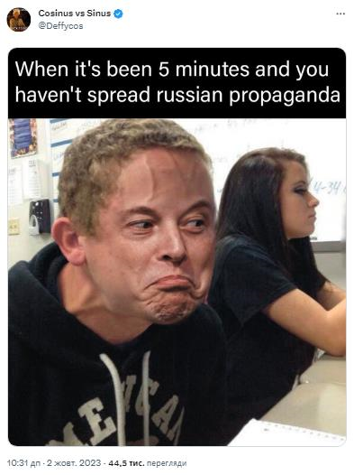 «Когда уже 5 минут не распространял российскую пропаганду», — ответил на сообщение Маска пользователь с ником Cosinus vs Sinus.