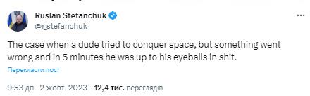 «Случай, когда чувак пытался покорить космос, но что-то пошло не так, и через 5 минут он был по уши в дерьме», — отметил председатель Верховной Рады Украины Руслан Стефанчук.
