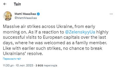Глава представительства Евросоюза в Украине Матти Маасикас заявил, что массированные удары РФ по Украине 10 февраля выглядят как «ответ» на успешные визиты украинского лидера Владимира Зеленского в европейские столицы. Об этом он написал в Twitter 10 февраля.