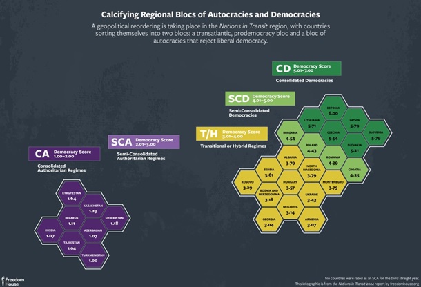 Украина улучшила показатели демократии в 2023 году среди 29 стран Центральной Европы и Центральной Азии, несмотря на продолжение полномасштабного вторжения России и на фоне общего ухудшения уровня демократического управления в регионе за последние 20 лет. Об этом говорится в отчете Страны переходного периода 2024 года (Nations in Transit 2024) международной правозащитной организации Freedom House.
