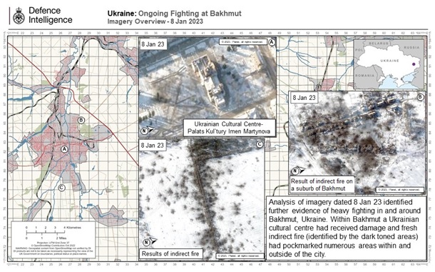 Также британская разведка публикует снимки, на которых видно, с начала января 2023 года юг и восток Бахмута продолжают подвергаться интенсивным артиллерийским обстрелам.