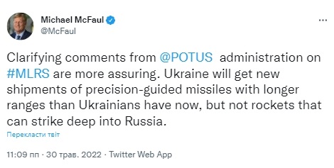 «Уточняющие комментарии от администрации Байдена по MLRS (РСЗО — ред.) более обнадеживающие. Украина получит новые партии высокоточных ракет с большей дальностью, чем сейчас есть у украинцев, но не ракет, способных нанести удар вглубь России», — написал Макфол.