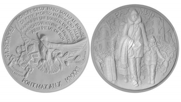 Впервые в истории монетный двор Ватикана выпустил медаль для благотворительных целей. Ее основная тема — это мир в Украине.